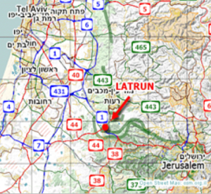 Latrun is een historisch gebied en een kruispunt in de zuidelijke Ayalon-vallei, waar de heuvels van Judea zo ongeveer beginnen, zo’n anderhalve kilometer van het historische Emmaüs, zo’n 25 kilometer ten westen van Jeruzalem en 45 km verwijderd van Jaffo-Tel Aviv. Latrun bevat ruïnes van een Arabisch dorp en een 12e-eeuws kruisvaardersfort dat zichtbaar op eerdere fundamenten is gebouwd. Op de helling is omstreeks 1890 een groot Frans trappistenklooster gebouwd dat bekend staat om zijn wijnen en olijfolie. Dit klooster is overigens in Italiaanse stijl gebouwd. Aan de voet van de heuvel is een van de belangrijkste historische kruispunten van Jeruzalem naar Tel Aviv en de aansluiting naar zowel het noorden als het zuiden van het land.